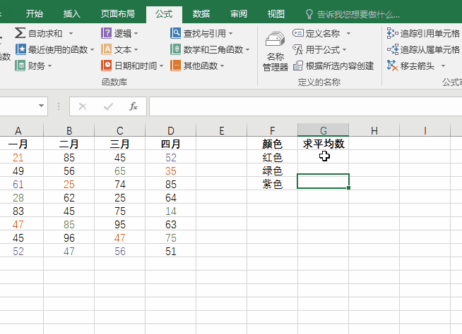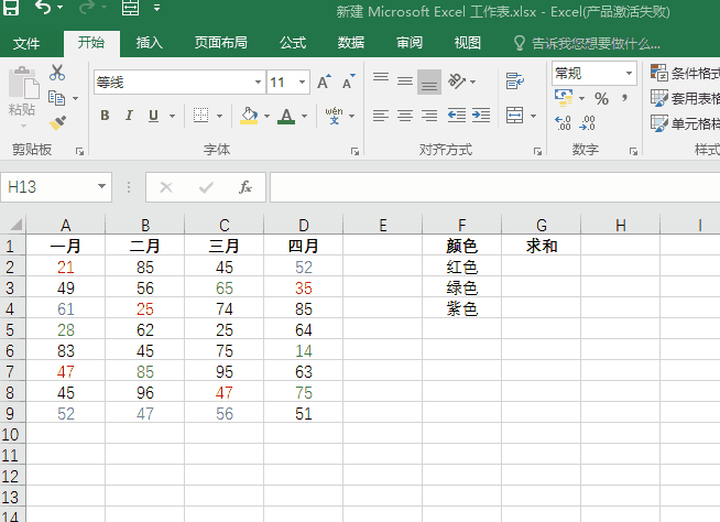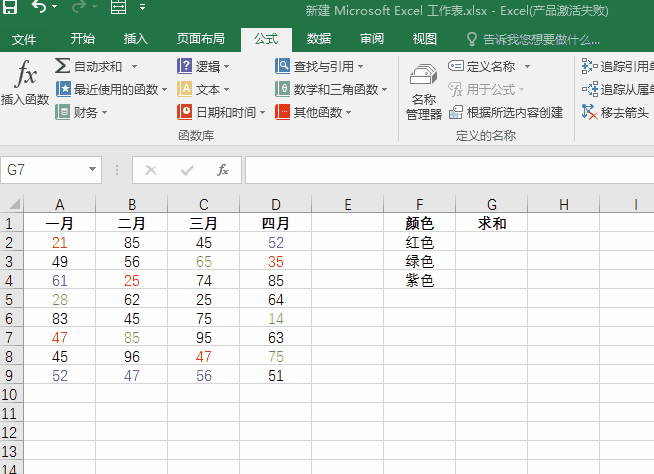 在指定单元格中输入:=SUM(红色),对红色数字求和;输入=SUM(绿色),对绿色数字求和,紫色数字同理。