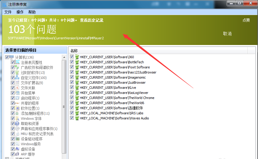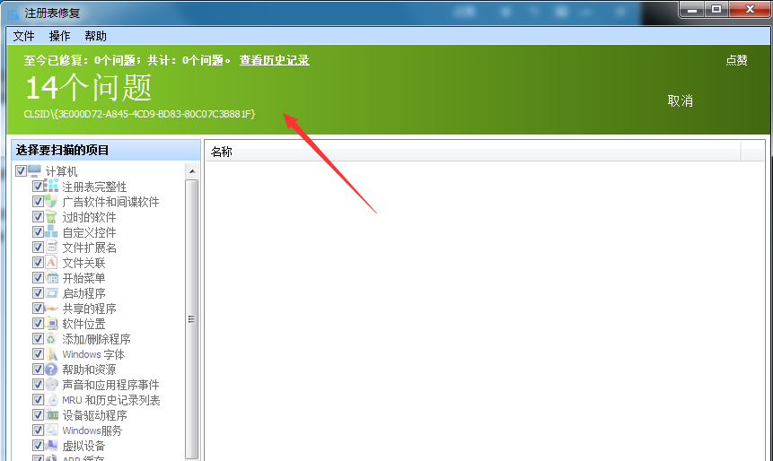 Glary Utilities此时会自动查找注册表的问题。