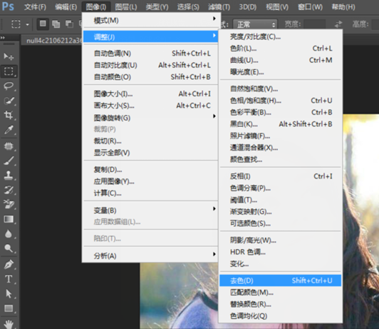 点击选中背景图层,然后点击菜单栏的【图像】-【调整】-【去色】,得到下图效果;