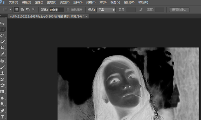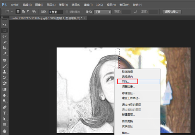 这时半素描的效果已经出来了,但中间那条线过于生硬,我们可以用羽化效果让它更柔和,用矩形选框工具框住中间那条线,然后点击鼠标右键,在弹出的选项中点击【羽化】,羽化半径大概5像素,点击【确定】后,按Delete健清除到自己满意的效果为止;