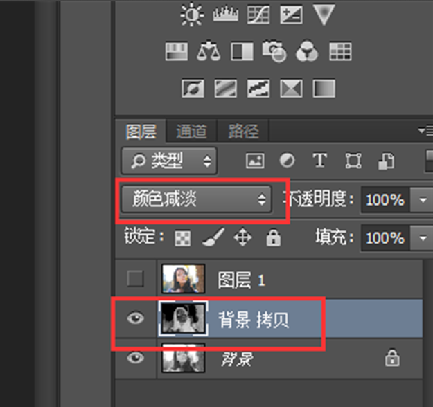 在图层面板里,点击选中背景拷贝图层,然后点击混合模式的下拉菜单,把【正常】模式改为【颜色减淡】模式,得到下图效果;