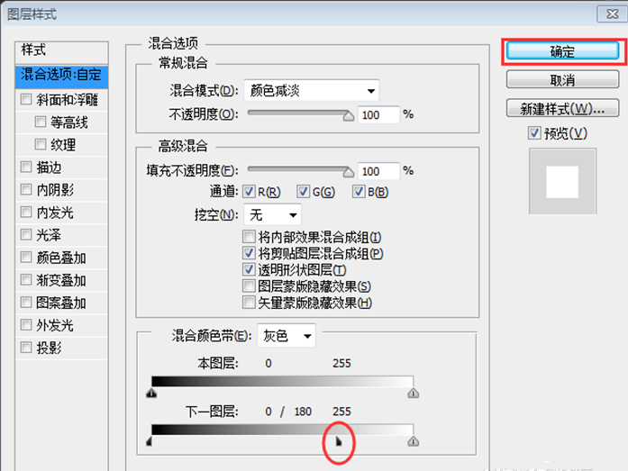 在图层面板里双击背景拷贝图层,此时会弹出图层混合模式窗口,连按住Alt健调整【下一层图层】的左右调节滑杆,将滑杆的右半边往右拉动,对头发进行加黑,调整好后点击【确定】,得到下图效果;