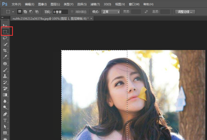 在图层面板里点击图层1前面的小眼睛,打开图层1,添加图层面板,在工具栏里用矩形选框工具,把人物图像左侧框起来,得到下图效果;