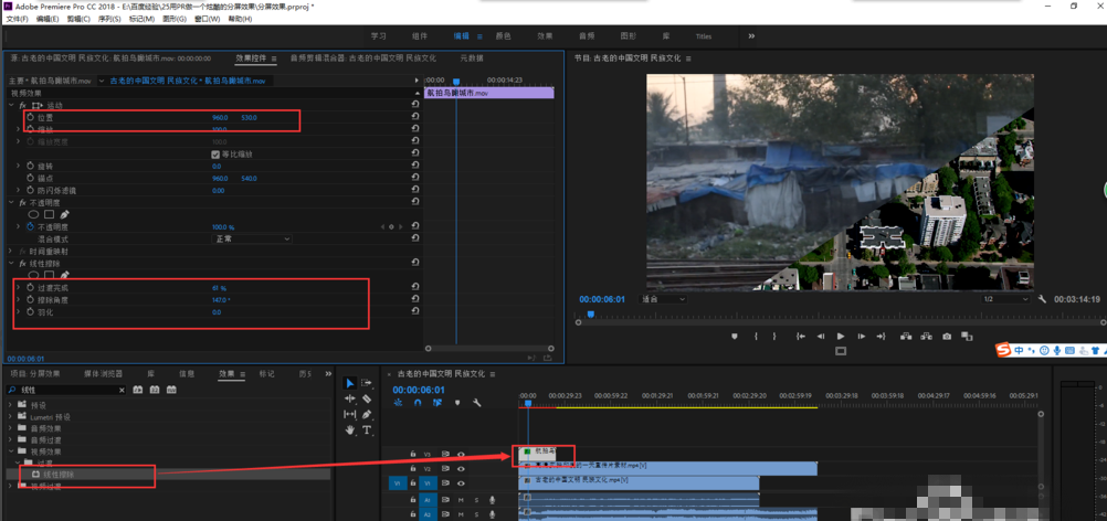 同理,选中轨道2视频,将线性擦除效果也施加给轨道2视频,在效果控件中调整线性擦除效果的过渡完成与擦除角度的数值。