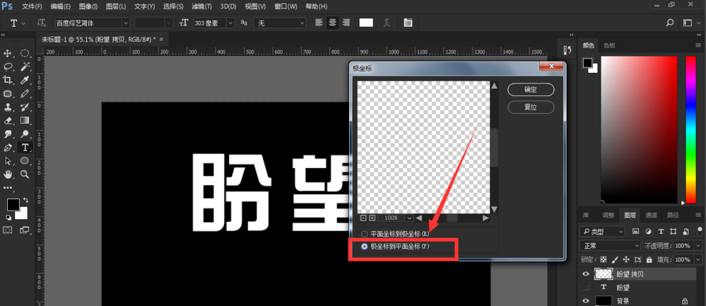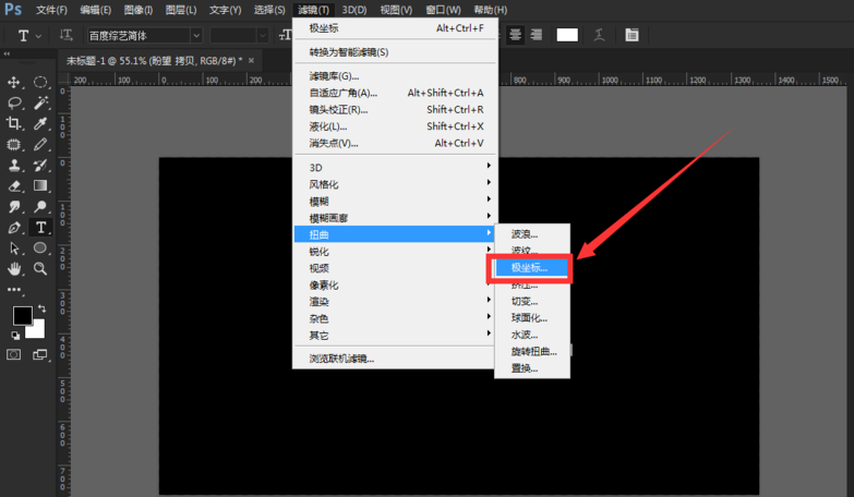 然后打开滤镜下的极坐标,选择下面的极坐标到平面坐标选项,点击确定,