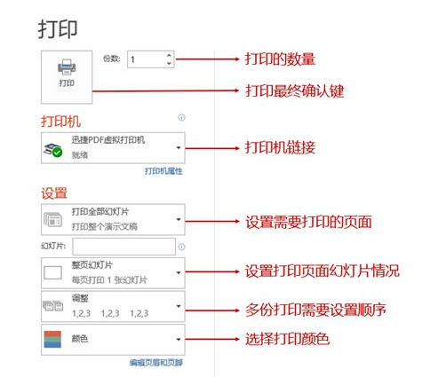首先我们来了解一些基本的打印操作,点击【文件】-【打印】选项,可以看到相应的打印选项,它们的具体功能在这里: