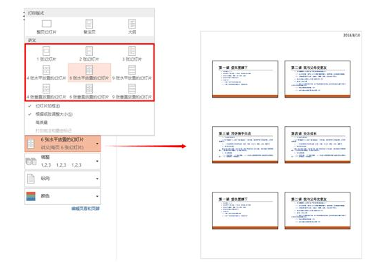 想要在一页纸上打印多张PPT,设置打印页面幻灯片情况,点击选择“6张水平放置的幻灯片”,就能在右边的预览图里看到一张纸上有6张幻灯片,同理,可以设置4或9张。