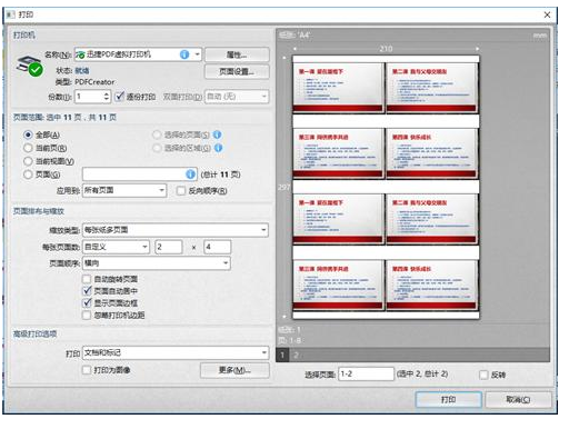 可以!打开迅捷PDF编辑器,把PPT存为PDF文件后导入进去,点击【文件】-【打印】,在【页面排布与缩放】里选择【每张纸多页面】类型,【每张页面数】选择【自定义】,修改为【2×4】的形式,也就是一页打印8张PPT,这是比较好的利用率。