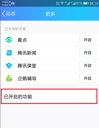 进入更多界面,点击已开启的功能,如下图所示: