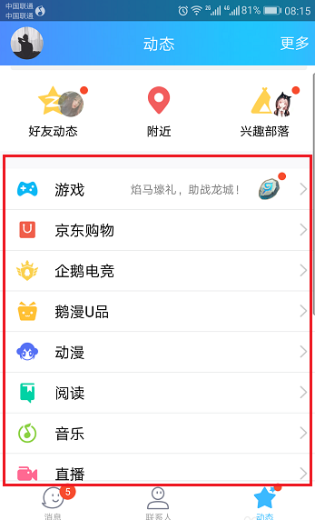 进去在动态中显示界面,点击好友微视,如下图所示: