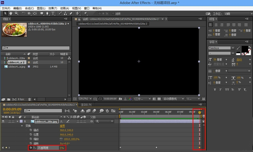 打开下拉编辑菜单,找到不透明度,在开始的位置添加关键帧,设置不透明度为0,
