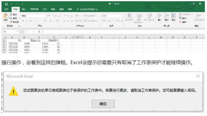 确认信息之后,你会发现这个Excel工作表格上方的按钮都变成灰色,表格内容也无法操作了。