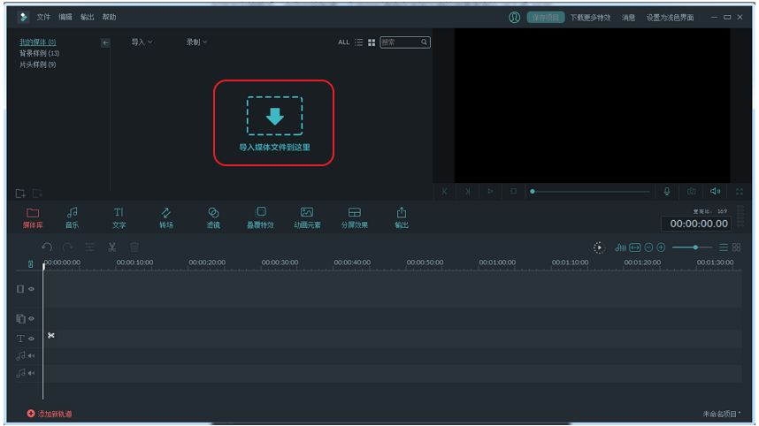 1、打开万兴神剪手,点击“媒体库”,把准备好的视频素材导入进来,拖拽到时间轨道上。