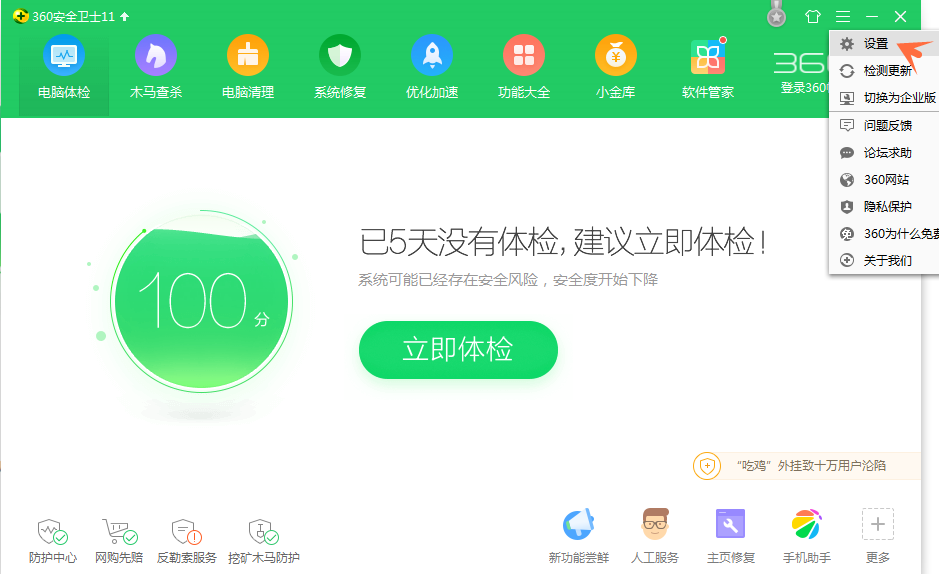 打开360安全卫士,点击右上角的“主菜单”按钮,如图,