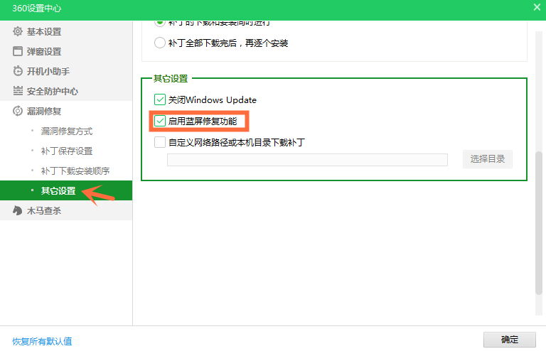 点击漏洞修复——其他设置,在右侧勾选启用蓝屏修复功能,如图。电脑出现蓝屏现象之后,就会重启,提示蓝屏修复。
