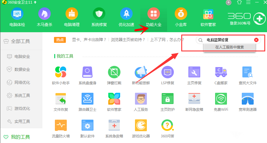 打开360安全卫士,在导航菜单中点击“功能大全”,进入页面,在右侧输入框中输入“电脑蓝屏修复”,进行搜索,