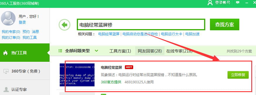 在人工服务中找到电脑经常蓝屏的修复方案,点击“立即修复”即可。