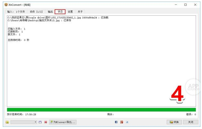 输出完成后,XnConvert自动跳转到“状态”页面,工作日志一目了然。