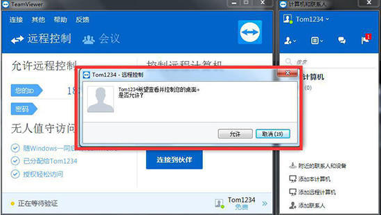 当然,你也可以选择使用密码登录,点击账号名称,在下拉列表中可以选择“远程控制(使用密码)”、“远程控制(提示确认)”、“编辑/删除计算机”以及“聊天”。需要确认的电脑界面如下图所示。