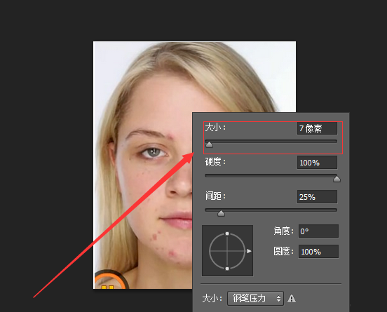 在图片上按鼠标右键,调整画笔大小,大小接近痘痘大小,