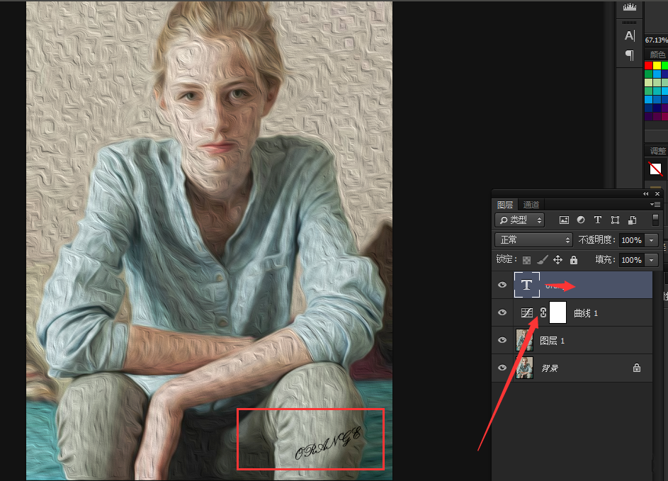 可以在素材右下角输入艺术名字,留下自己的标记,油画效果制作完成。