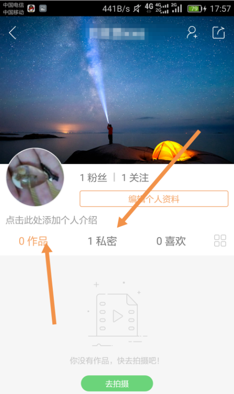 退出去,来到个人信息页面,看到“作品”栏少了一个,说明我们已经将作品隐藏啦。