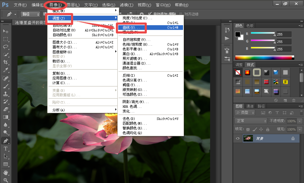 点击菜单栏上的图像——调整——曲线;