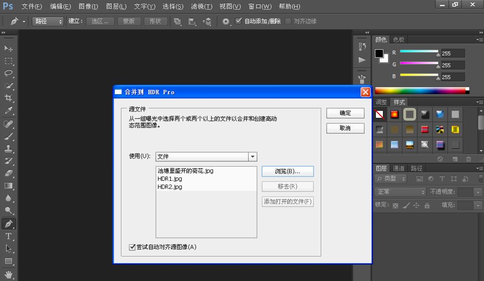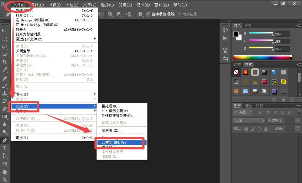 关闭所有图像,选择“文件”-“自动”-“合拼到HDR Pro”;