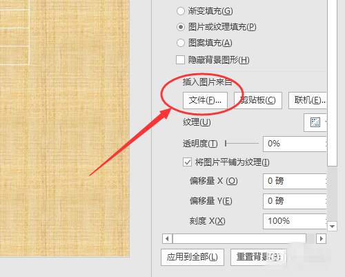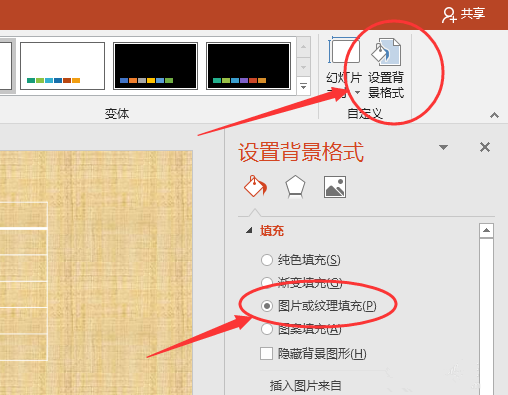在右侧的【设置背景格式】-【填充】中选择【图片或纹理填充】,