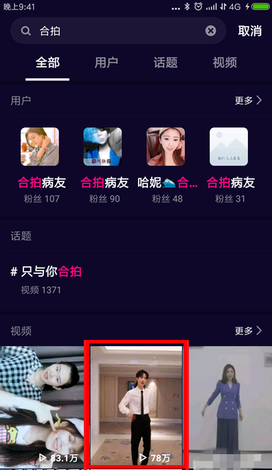 搜索结果中会出现很多视频,这些视频都可以进行合拍,任意点击一个视频进行确定。