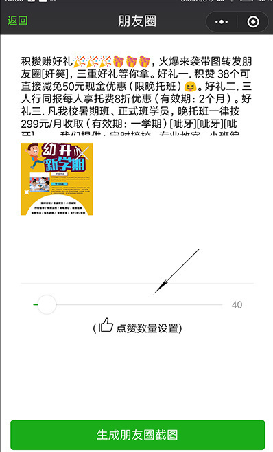 3.进入界面添加积赞内容。比如说要转发的文字、商家给出的广告图等等,最后拖动滑杆设置具体的点赞数量;