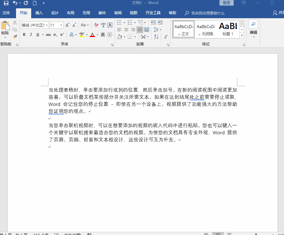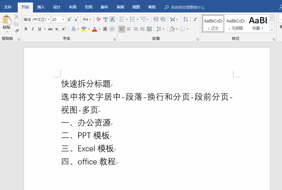 全选文字并居中——段落——换行和分页——视图——多页