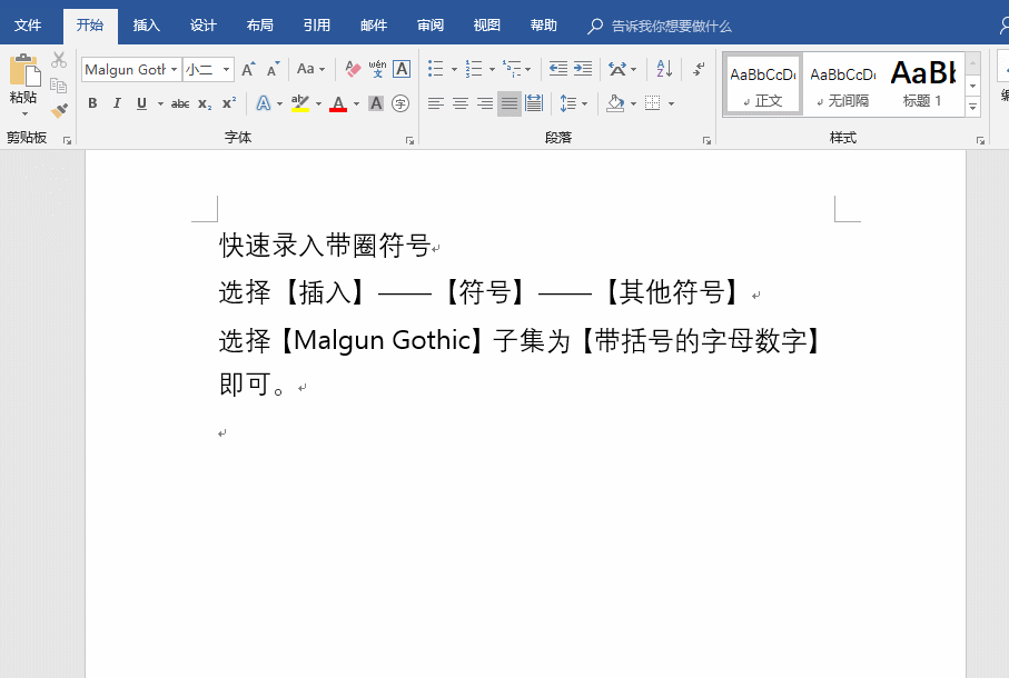 选择【插入】——【符号】——【其他符号】——选择【Malgun Gothic】子集为【带括号的字母数字】即可。