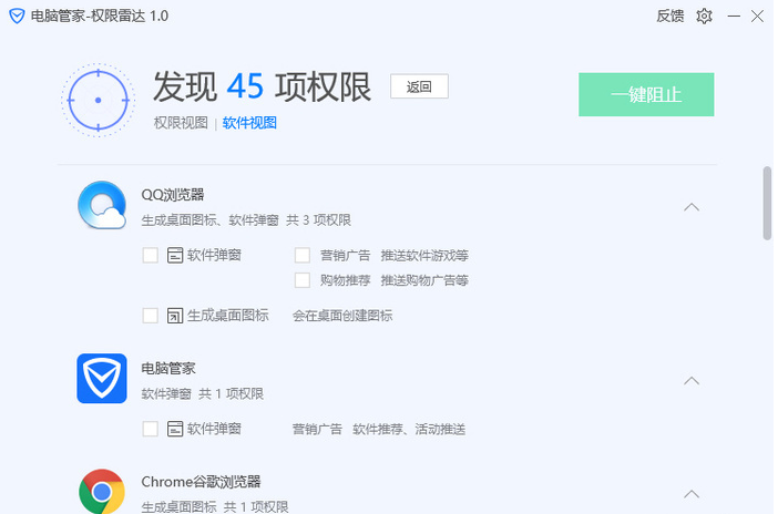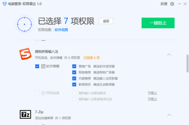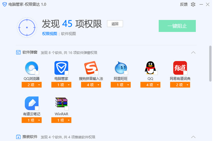 在扫描结果中,权限雷达对软件所申请的权限都进行了解释,这就避免了用户误禁用权限的情况发生。对于想要禁用的软件权限,用户只需要勾选然后选择一键阻止即可。
