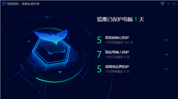 除了权限雷达功能,电脑管家纯净版还带给用户“猎鹰全景防御系统”,该系统可以提供三大分类(系统核心、应用接入、网络边界)共17项的防护措施,可以监控进程行为,实时发现和拦截恶意程序和病毒木马。