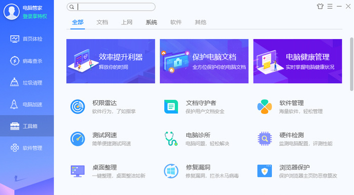电脑管家工具箱里的小工具越来越多,要找哪个起来就不方便了,电脑管家纯净版增加了搜索功能,方便用户快速定位小工具。
