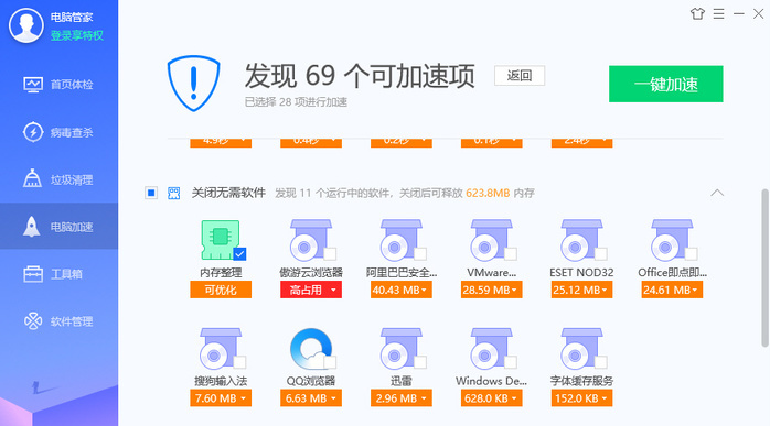 电脑管家纯净版还升级了电脑加速功能,增加了误关软件智能提醒,避免用户错误关闭软件,比如正在编辑尚未保存的办公软件。