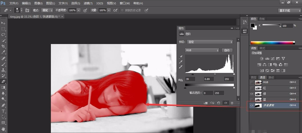 在通道上面建一个图层蒙版,将美女的脸部全部涂红;