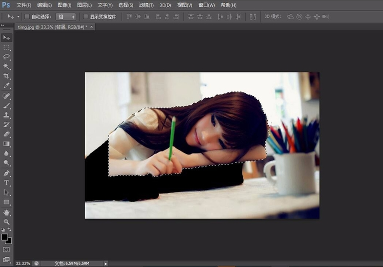 打开原图就可以看到选择的区域,美女图片就这样被抠出来了,可以随意将美女图片拉到其它背景图中。
