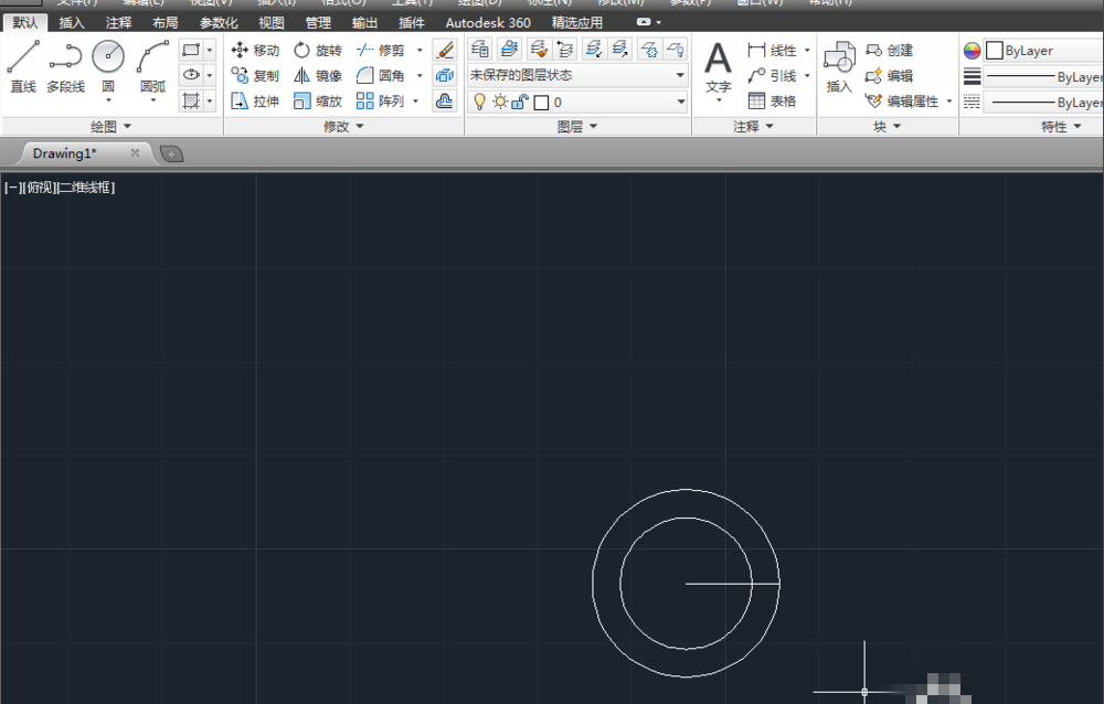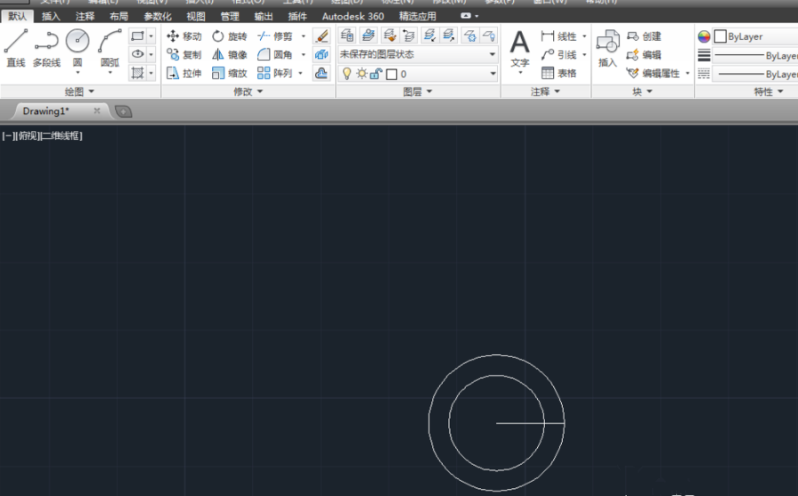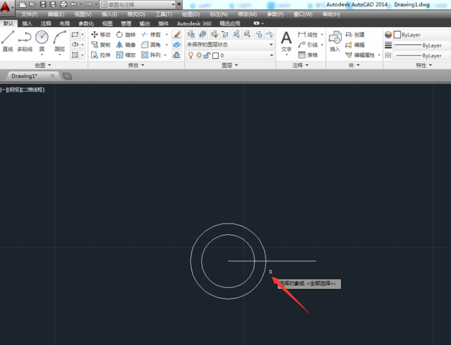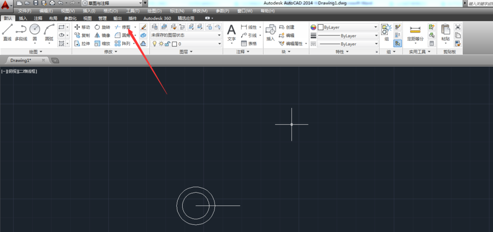 打开Auto CAD软件,现在是两个同心圆多出来一条横线,横线长度超出圆的半径了,找到修改单元,点击修剪命令,