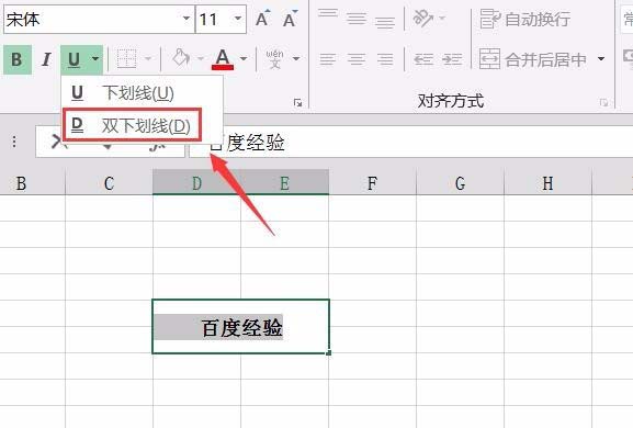 6、点击下划线在其下拉菜单那里找到双下划线选项,如图所示:
