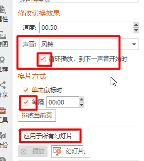 4、设置声音,勾选“循环播放”换片方式那里勾选两个选项(看图),点击“应用于所有幻灯片”