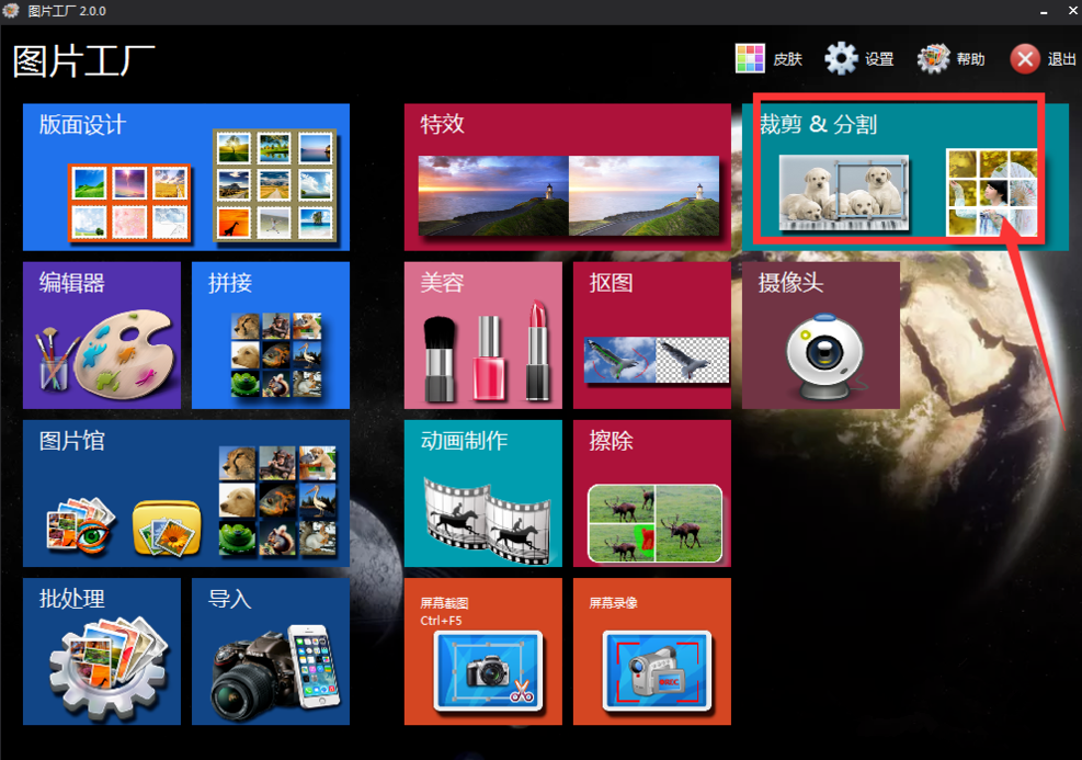 打开图片工厂,点击打开“裁切、分割”选项,