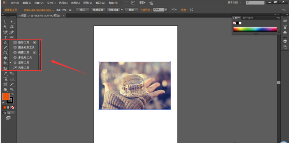 打开Adobe Illustrator软件,导入一张图片,在工具栏中选择一个矩形工具,