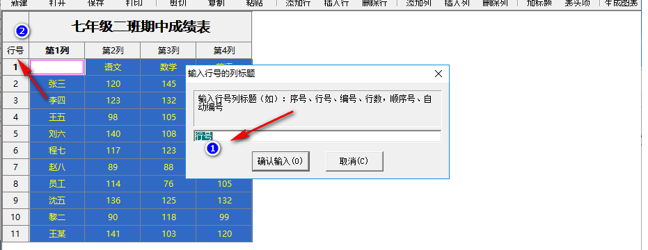 9、点击“表头项”可以在这里设置新的项目名字,例如序号、行号、编号、行数,顺序号