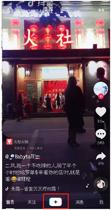 1、打开抖音APP,进入页面,点击“+”,