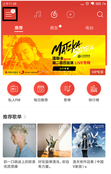 打开手机网易云音乐,进入页面,点击左上角的【三】选项。