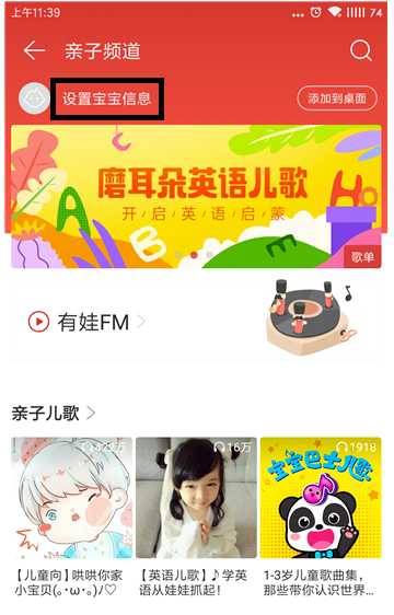 进入亲子频道,这里都是适合孩子听的音乐,点击【设置宝宝信息】。