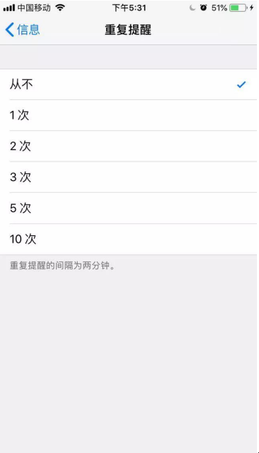 依次点击:设置 → 通知 → 信息 → 重复提醒 → 从不