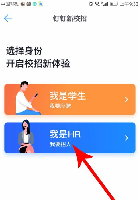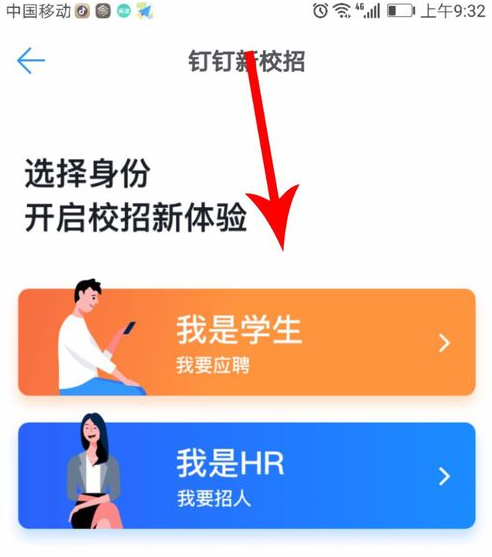 打开钉钉新校招服务,需要您的身份,若您是一名学生,就点击“我是学生”。